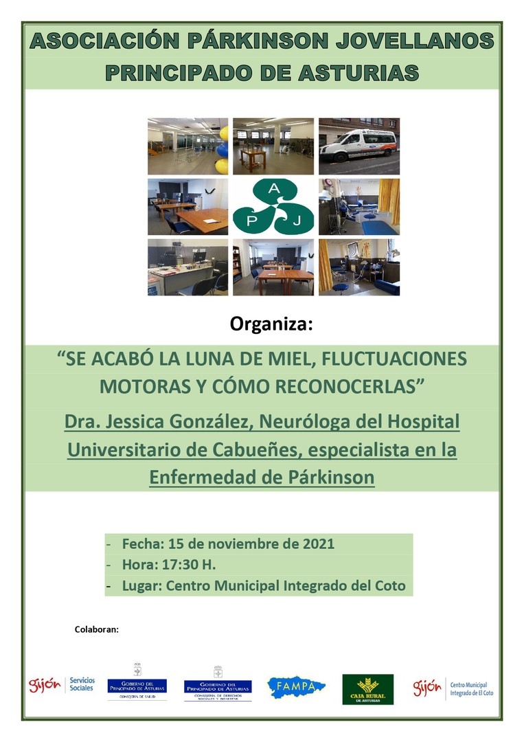 Día 15 de Noviembre la Dra. Jéssica González, Neuróloga del Hospital Universitario de Cabueñes impartirá una charla sobre "Las fluctuaciones motoras y cómo reconocerlas", será en el Centro Municipal Integrado del Coto a las 17:30